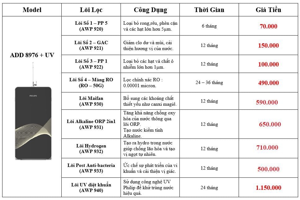 Máy lọc nước Philips ADD8976 được trang bị hệ thống lõi lọc cao cấp kết hợp công nghệ màng RO và đèn UV diệt khuẩn, mang đến nguồn nước tinh khiết, an toàn tuyệt đối cho sức khỏe. Việc thay lõi định kỳ giúp đảm bảo hiệu quả lọc tối ưu và kéo dài tuổi thọ máy.