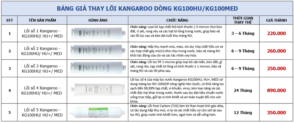 Bảng Giá Thay Thế Lõi KG100HU/KG100HU+/KG100MED
