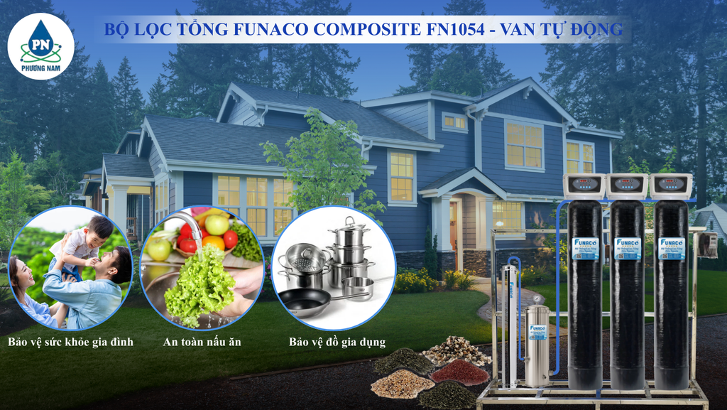 Bộ Lọc Tổng Funaco Composite FN1054-3 – Van Tự Động là hệ thống lọc nước đầu nguồn cao cấp được thiết kế với 3 cột lọc composite kết hợp màng lọc UF công suất 3000L/h và phin lọc inox 3 cấp, giúp xử lý triệt để các tạp chất, vi khuẩn, kim loại nặng, phèn, clo và cặn bẩn trong nguồn nước sinh hoạt.