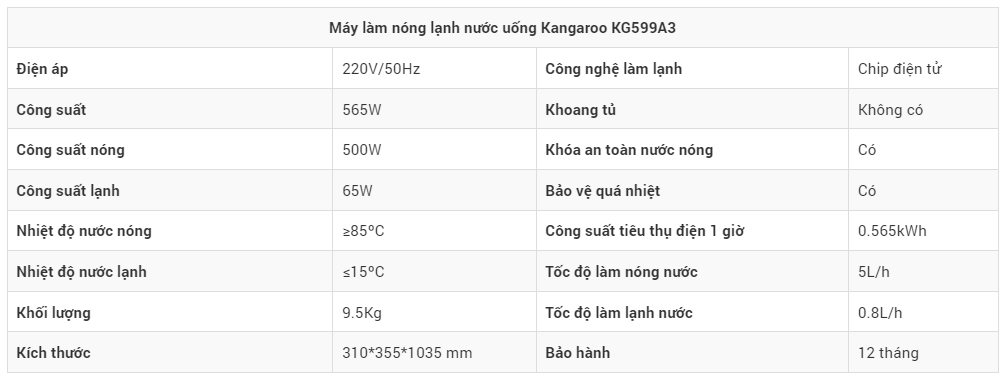 KG599A3 của Kangaroo có công suất tổng 565 W, trong đó làm nóng 500W và làm lạnh 65W. Công suất tiêu thụ điện trong 1 giờ là 0.565 kWh. Công nghệ làm lạnh bằng chip điện tử giúp máy hoạt động êm ái, tiết kiệm điện, kiểm soát nhiệt độ tốt.