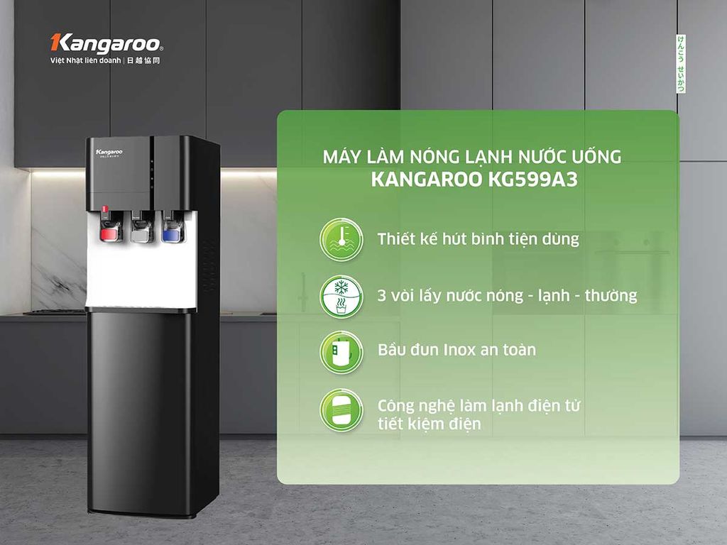 Máy làm nóng lạnh nước uống Kangaroo KG599A3 với màu sắc trang nhã, thiết kế âm bình gọn gàng, hiện đại phù hợp không gian của gia đình, văn phòng, nhà hàng, trung tâm thương mại… 3 vòi riêng biệt cùng 3 chế độ nước nóng – lạnh – thường tiện lợi phục vụ mọi nhu cầu giải khát và chế biến.