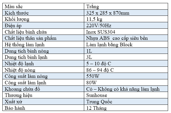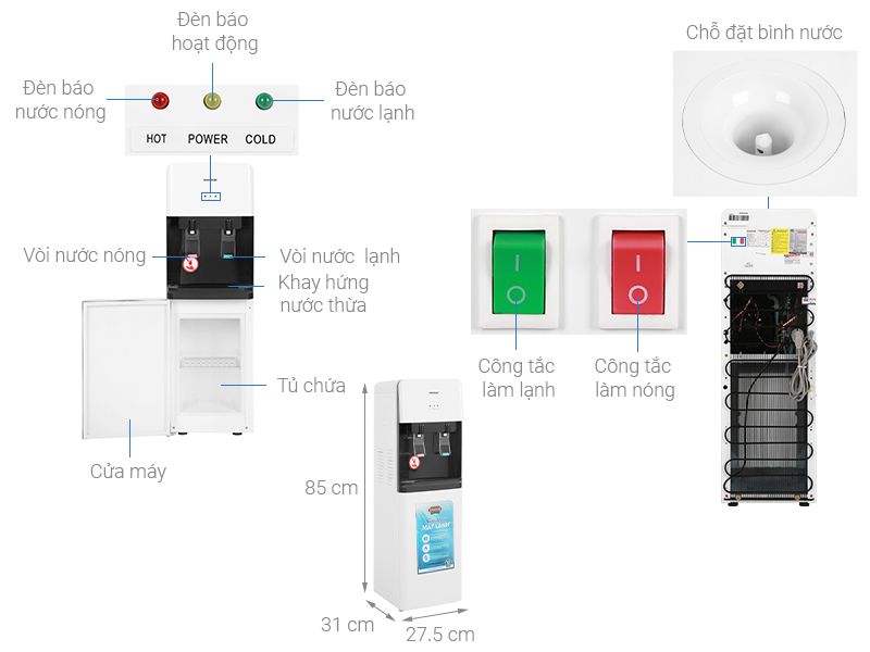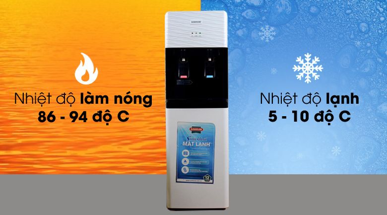 Cây nước nóng có nhiệt độ làm nóng từ 86 – 94 độ C (số lít làm nước nóng 5 lít/giờ), nhiệt độ làm lạnh từ 5 – 10 độ C (số lít làm nước lạnh 2lít/giờ); Giúp mang đến cho người dùng nước nóng, nước lạnh dồi dào sử dụng để pha chế mi, sữa, trà, uống giải khát tiện lợi.