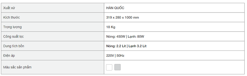 Dung tích bình chứa lớn: 2.2L cho bình nóng và 3.2L cho bình lạnh đảm bảo lượng nước sử dụng cho cả gia đình, văn phòng làm việc cả ngày dài.
