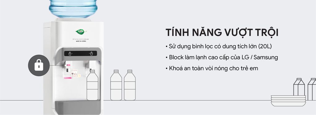 Sản phẩm máy úp bình nóng lạnh có khóa an toàn vòi nóng, giữ an toàn tuyệt đối cho trẻ em và người lớn tuổi. Khay hứng nước thừa có thể dễ dàng tháo rời để vệ sinh khi cần, giúp bạn không lo nước rơi xuống sàn nhà, rất sạch sẽ và khô ráo.