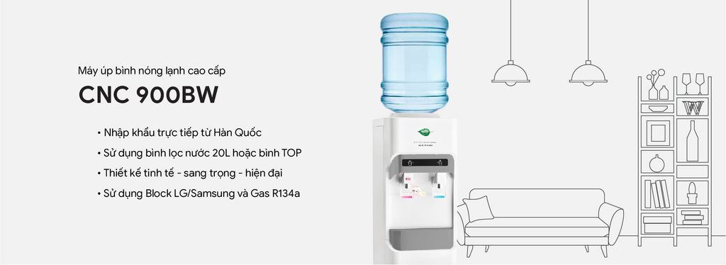 Máy úp bình nóng lạnh CNC900BW được sản xuất và nhập khẩu nguyên chiếc chính hãng Hàn Quốc, đảm bảo sự tin cậy cho khách hàng. Máy sử dụng bình nước 20L, bình top lọc nước CNC TOP hoặc bình top lọc nước KENT CRYSTAL rất tiện lợi và tiết kiệm thời gian với khả năng làm nóng, lạnh nước trực tiếp, nhanh chóng. Sản phẩm phù hợp với mọi đối tượng sử dụng tại việt Nam như: công sở, trường học, văn phòng, gia đình...