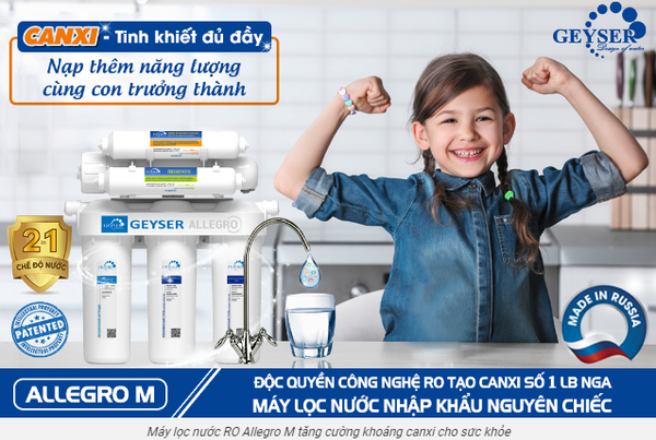 Máy Lọc Nước RO Geyser Allegro M cho ra 2 loại nước thích hợp dùng cho 2 mục đích : Nước tinh khiết dùng để đun nấu cho vị thức ăn ngon hơn và không bị đóng cặn. Nước có khoáng canxi dùng để uống trực tiếp giúp cơ thể hấp thụ canxi tốt cho xương, tốt cho sức khỏe.