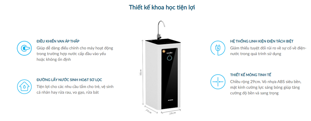 Hệ thống 3 lõi lọc thô, Màng RO thay nhanh 100GPD (Mỹ/Hàn Quốc) và các lõi chức năng giúp loại bỏ hầu hết vi khuẩn, các ion kim loại nặng và các tạp chất khác, đồng thời ổn định vị ngọt của nước, cung cấp các vi khoáng có lợi cho cơ thể.