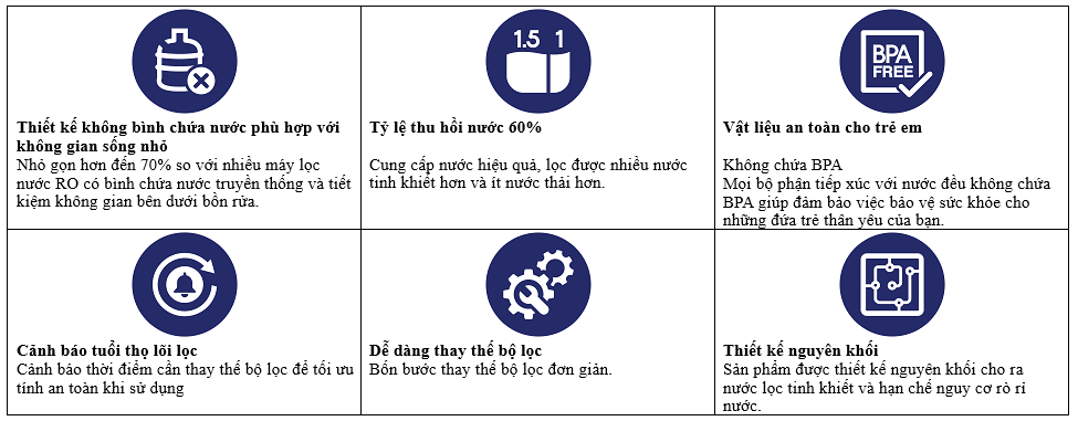 Công suất bộ lọc RO 11,000 lít, tốc độ lọc nhanh 1 lít nước tinh khiết/ phút (tương đương 60 lít nước tinh khiết/ giờ)