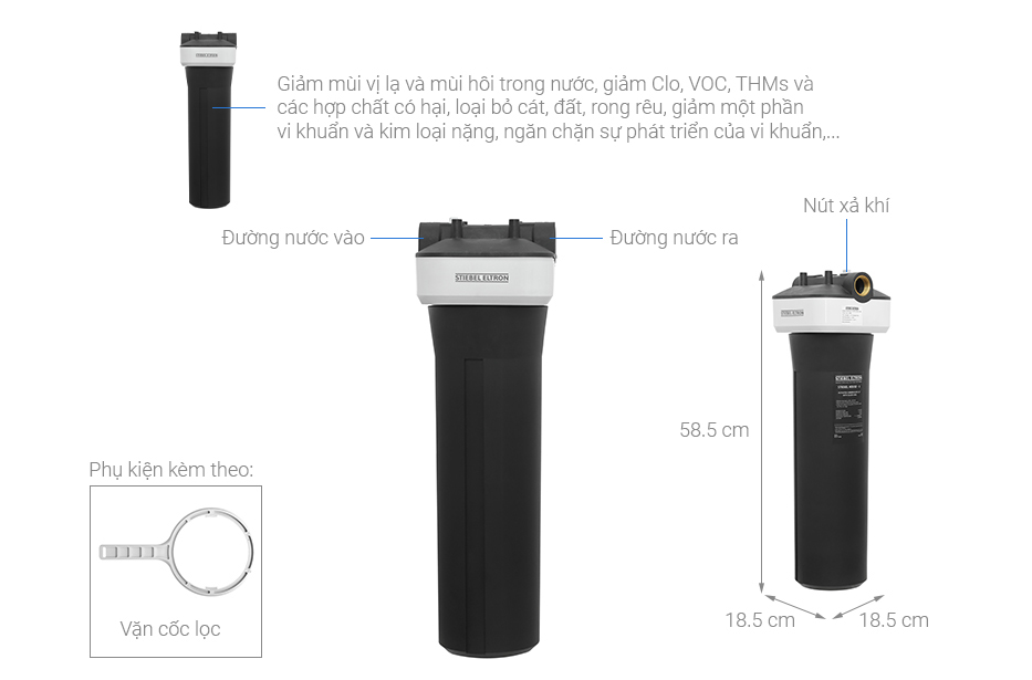 Bộ lọc sinh hoạt đầu nguồn Khối than hoạt tính Stiebel House (Stiebel House ACB-2) được làm bằng bột than dừa chất lượng cao tẩm ion bạc để giảm mùi vị khó chịu và chất gây bẩn có hại trong nước ngọt bằng cách loại bỏ các hạt, clo, một số vi khuẩn và kim loại nặng. Ion bạc được thêm vào carbon làm giảm sự phát triển của vi khuẩn bên trong lõi lọc. Bộ lọc sơ cấp Stiebel House ACB là sự lựa chọn hoàn hảo để lắp đặt cho bộ lọc tại cả điểm đầu vào và điểm sử dụng.