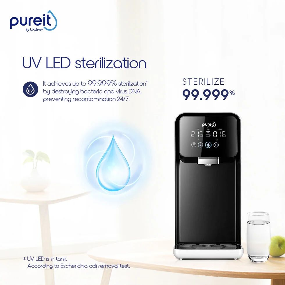 Máy giúp khử trùng nước 24/7 bằng cách tiêu diệt tới 99,999% DNA của vi khuẩn và vi-rút, do đó ngăn ngừa khả năng tái nhiễm.