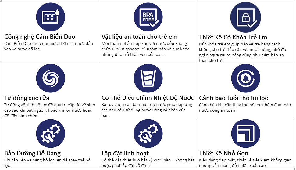 | Tiện ích | - Tốc độ dòng chảy: Khoảng 15 lít mỗi giờ (tùy thuộc vào chất lượng nguồn nước đầu vào) - Tỷ lệ thu hồi nước tinh khiết theo tiêu chuẩn công nghệ quốc tế 66,67% (tùy thuộc vào chất lượng nguồn nước đầu vào) - Công nghệ tự động làm sạch lồng máy đảm bảo vệ sinh an toàn cho thiết bị - Khóa an toàn cho trẻ - Vệ sinh tự động - Thiết kế nhỏ gọn phụ hợp mọi không gian - Tự thay lõi lọc tại nhà - Màn hình kỹ thuật số cảnh báo thay lõi lọc - Công nghệ Smart Hot |