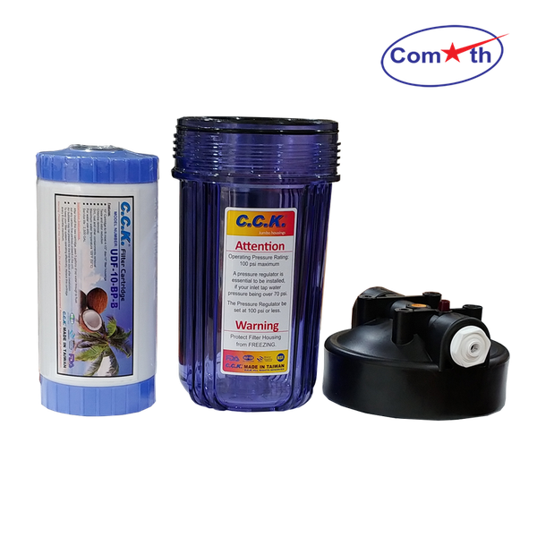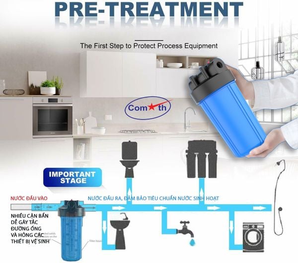 Lọc Thô Đầu Nguồn 10inch Comath C907-1 tích hợp lõi lọc công nghệ kép 2 trong 1 loại bỏ tạp chất cặn bẩn và hóa chất tồn dư trong nước: Clo, hợp chất clo... Nhỏ gọn phù hợp lắp đặt chung cư, nhà dân.