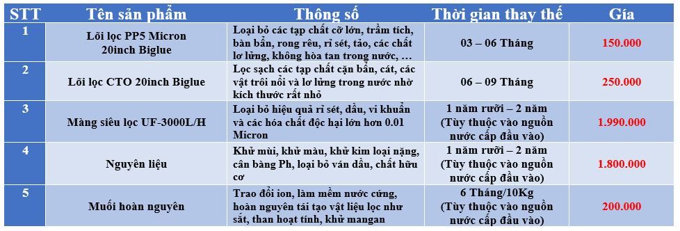 | Thời gian thay lõi | PP 5micron: 3-6 Tháng CTO than nén: 6-9 Tháng UF 3000L: 24 Tháng Vật liệu lọc & trụ làm mềm: Vật liệu bên trong thiết bị có thể tự động sục rửa, không cần thay lõi thường xuyên |
