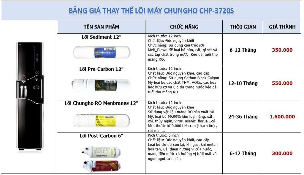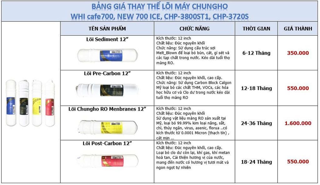 Dễ dàng thao tác lắp đặt: - Ngắt nguồn nước cấp cho máy lọc nước - Vặn ngược theo chiều thẳng đứng để tháo lõi lọc cũ hết hạn - Lắp lõi lọc mới. Lắp cho máy lọc nước Chungho cây đứng như CHP-3800ST, CHP-3720S, Whi Caffe, New 700 Ice Ghi chú: Lõi lọc nên được thay thế định kỳ sau 6 tháng (Với lượng nước sử dụng trung bình 20l/ngày)