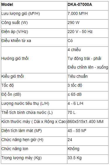 Quạt làm mát hoạt động theo nguyên lí bằng hơi nước với cách hạ nhiệt theo quá trình bốc hơi nước hình thành mưa, tạo một vòng quay tuần hoàn duy trì sự sống. Vì vậy, DKA-07000A làm chọn cách làm mát bằng hơi nước không những điều chỉnh nhiệt độ về mức lý tưởng mà còn điều chỉnh mức độ ẩm từ 55-65% giúp tốt cho da và sức khỏe.