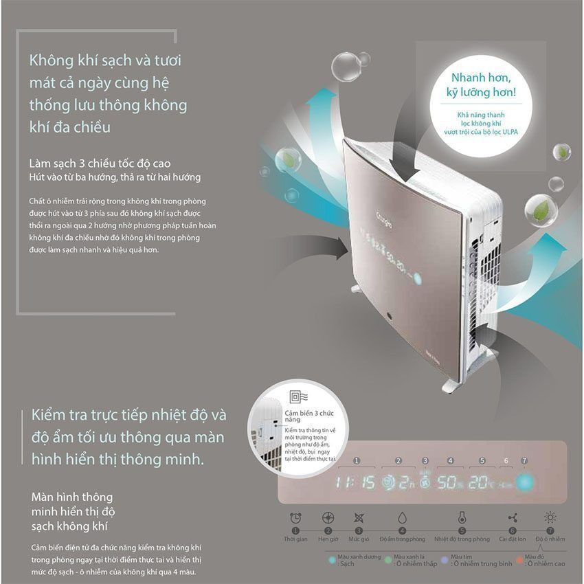 Các chất gây ô nhiễm trong phòng được hút vào cửa ở ba chiều, không khí sạch và trong lành được thổi ra hai cửa xả gió. Hệ thống lưu thông không khí lập thể 3D cho phép không khí trong nhà nhanh chóng được làm sạch hiệu quả.