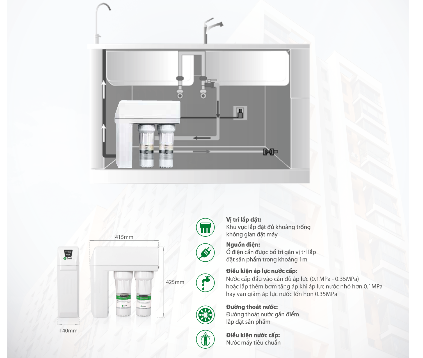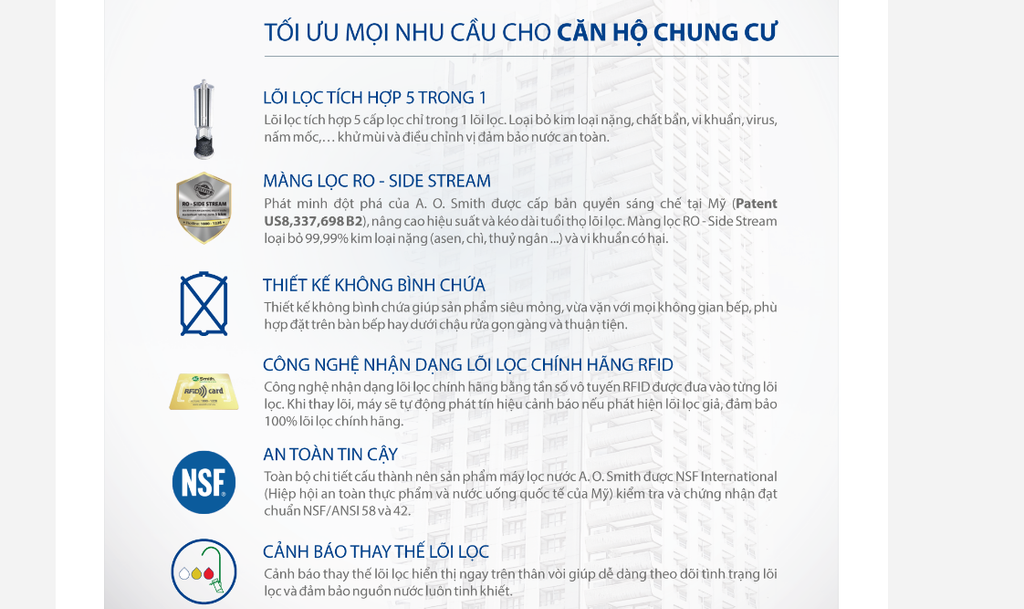Máy Lọc Nước A. O. Smith R400E Giải pháp cho những căn hộ chung cư có diện tích bếp nhỏ hẹp. Máy lọc nước thế hệ mới tích hợp đầy đủ tính năng, tối ưu mọi nhu cầu căn hộ chung cư