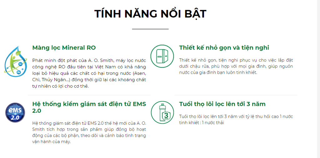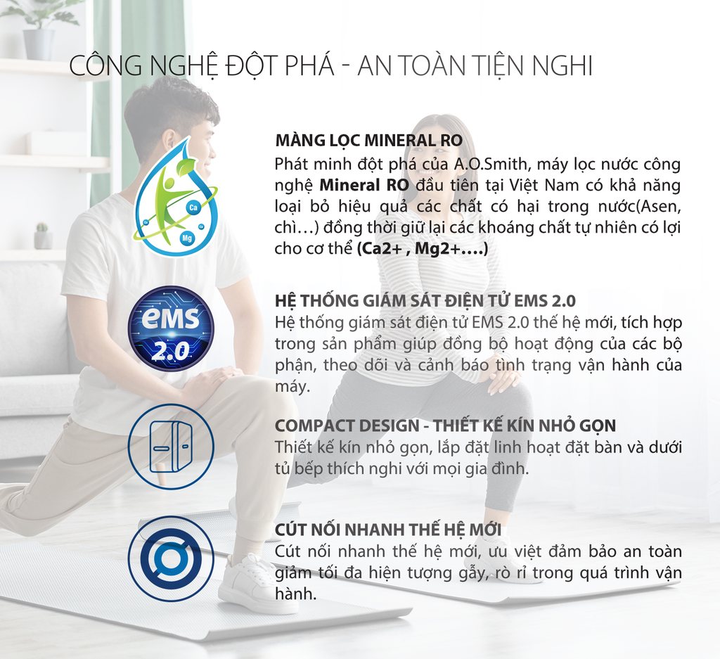 Máy lọc nước A. O. Smith VITA là máy lọc nước công nghệ Mineral RO có khả năng giữ khoáng tự nhiên giúp bù lại một phần lượng khoáng đã mất sau khi vận động. Với thông điệp "Giữ khoáng tự nhiên, khơi nguồn sức sống", A. O. Smith mong muốn đem lại một cuộc sống cân bằng, tràn đầy năng lượng cho người trẻ năng động Những phút giây tập luyện hay work from home sẽ tuyệt vời hơn khi có máy lọc nước A. O. Smith VITA.