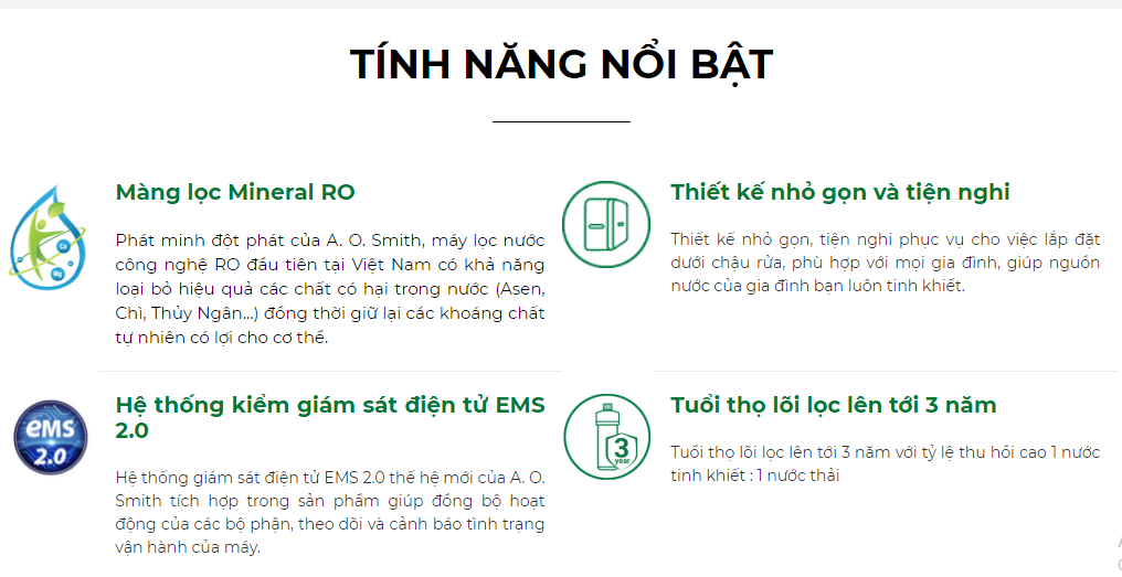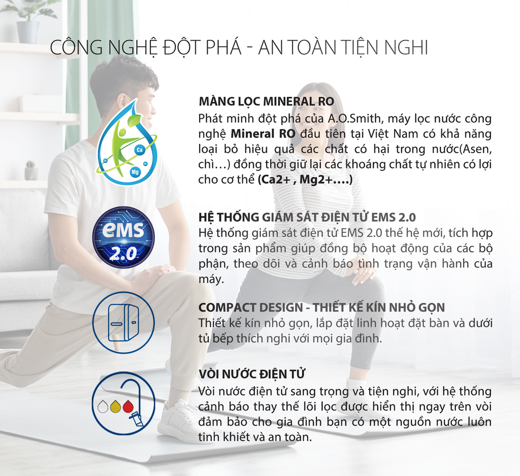 Máy lọc nước A. O. Smith VITA là máy lọc nước công nghệ Mineral RO có khả năng giữ khoáng tự nhiên giúp bù lại một phần lượng khoáng đã mất sau khi vận động. Với thông điệp "Giữ khoáng tự nhiên, khơi nguồn sức sống", A. O. Smith mong muốn đem lại một cuộc sống cân bằng, tràn đầy năng lượng cho người trẻ năng động Những phút giây tập luyện hay work from home sẽ tuyệt vời hơn khi có máy lọc nước A. O. Smith VITA.