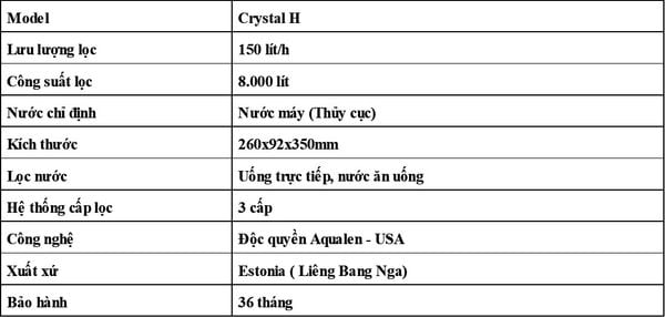 Chỉ số kỹ thuật nước lọc của Máy lọc nước Aquaphor crystal