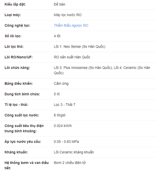 Công suất lọc đạt 8 lít/giờ, bình chứa nước có dung tích 5 lít, đáp ứng nhu cầu nước hằng ngày của gia đình bạn