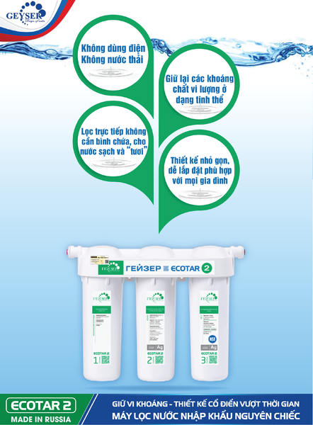 Máy Lọc Nước Geyser Ecotar 2 – Made in Russia là dòng máy lọc nước nhập khẩu nguyên chiếc của Geyser tại Việt Nam. Với thiết kế chuẩn ren, giá rẻ, nhập khẩu và rất được khách hàng ưa chuộng.
