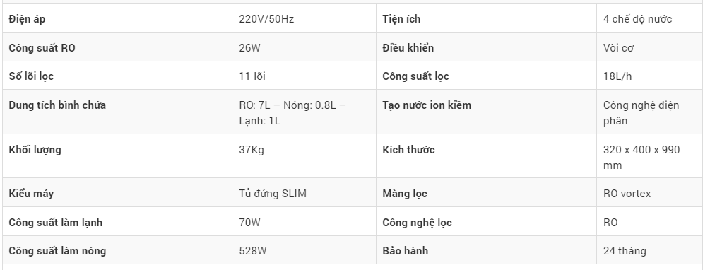 Sử dụng hệ lõi siêu lọc 11 lõi vượt trội, Máy lọc nước nóng lạnh Kangaroo KG100EHC sẽ tạo nguồn nước ion kiềm giàu Hydrogen, hỗ trợ bổ sung vi khoáng có lợi cho cơ thể. Công suất lọc lớn 18L/h phù hợp nhu cầu của gia đình đông người. Công nghệ dòng chảy xoáy từ màng RO Vortex Hàn Quốc giảm đóng cặn bề mặt màng, tăng tuổi thọ và giảm nước thải.