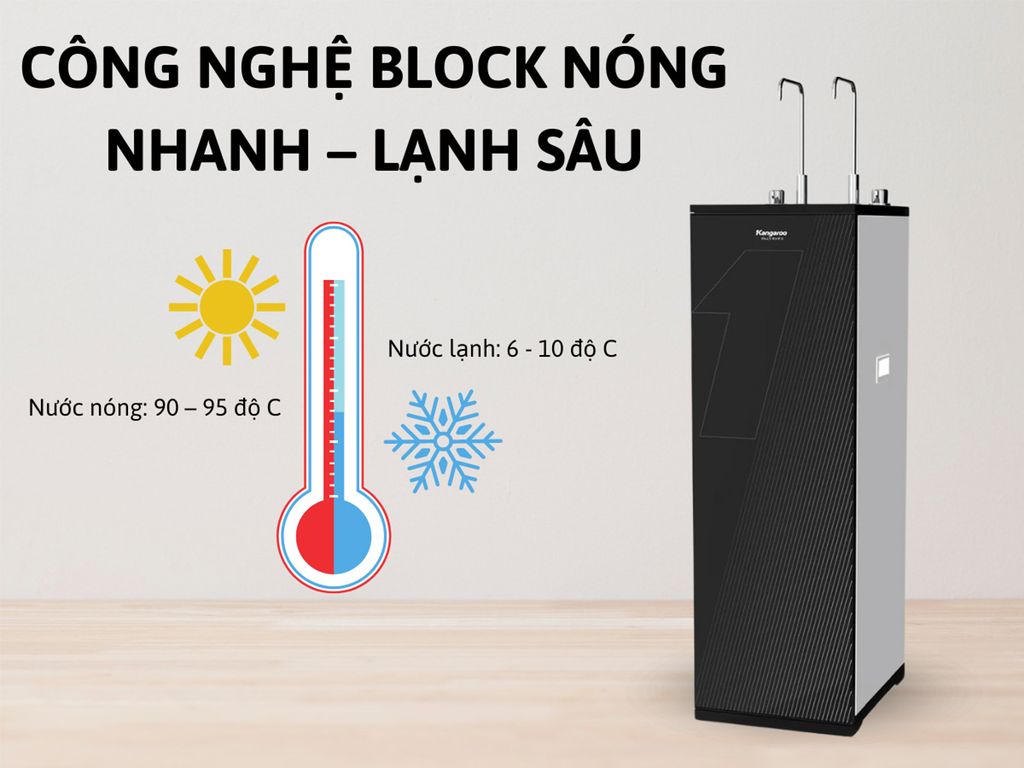 Công nghệ Block hiện đại được trang bị cho Máy lọc nước Kangaroo Hydrogen KG100EHC giúp nước nóng nhanh, lạnh sâu và nhanh. Nhiệt độ nước nóng đạt 90 – 95°C, nước lạnh đạt 6 – 10°C, tương đương với nước mát tủ lạnh. Dung tích bầu lạnh 1 lít thỏa mãn gia đình đông người.