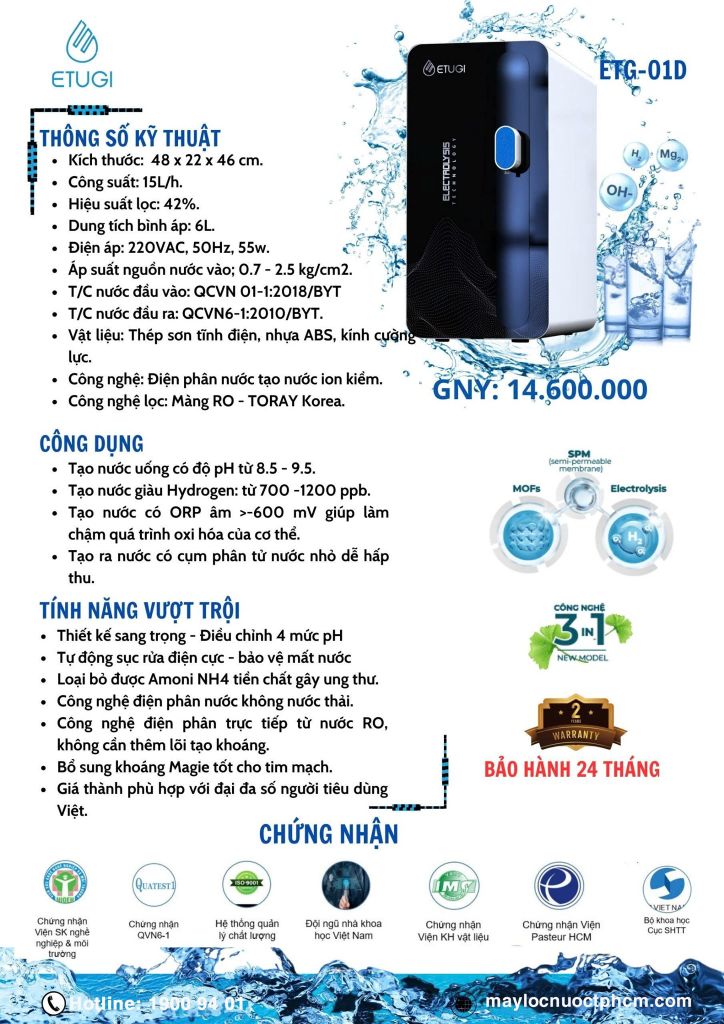Hiện nay trên thị trường máy lọc nước ion kiềm thì Etugi chính là đơn vị tiên phong đi đầu trong lĩnh vực điện phân trực tiếp nước R.O mà không cần sử dụng lõi tạo kiềm hay lõi tạo khoáng. Sản phẩm sau điện phân là nước tốt với pH từ 8.5 – 9.5 giàu Hydrogen phân tử, thế oxi hóa khử ORP âm, cụm phân tử nước nhỏ và đặc biệt chứa hàm lượng khoáng Magie tốt cho sức khỏe tim mạch.