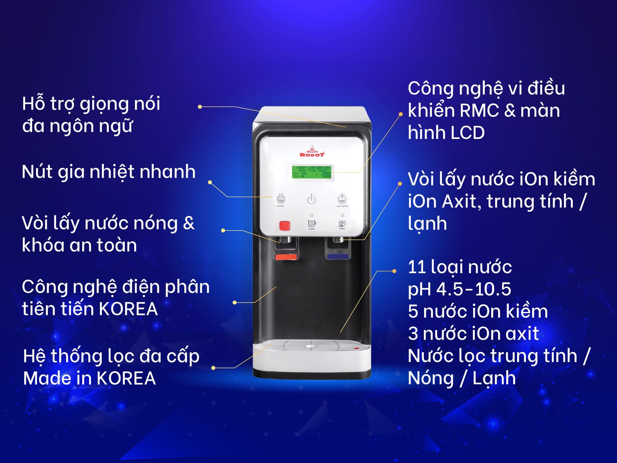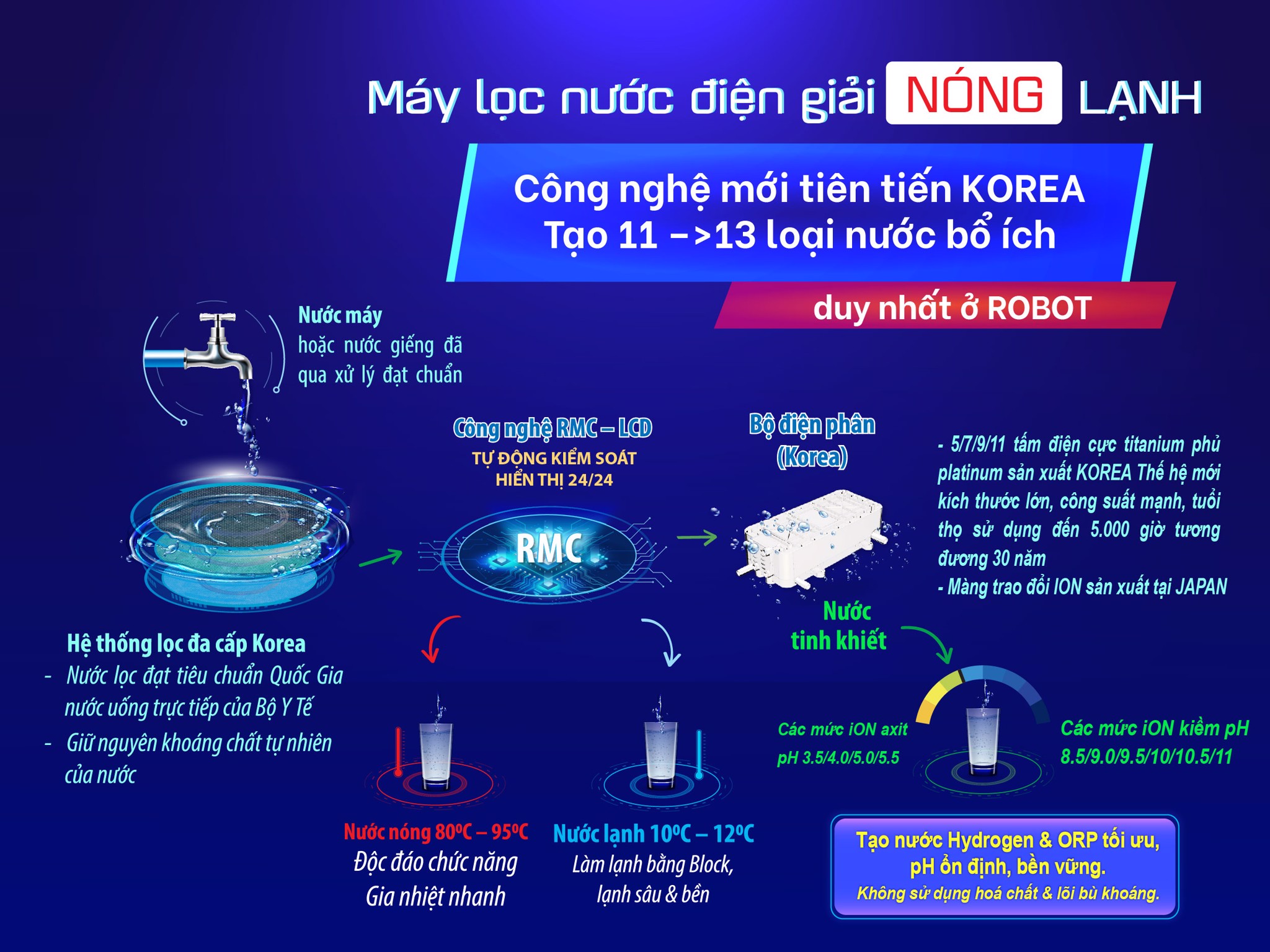 Máy lọc nước điện giải iON kiềm Nóng Lạnh ROBOT là sản phẩm Thế Hệ Mới nhất, tích hợp công nghệ Korea & RMC ROBOT, hệ thống lọc & điện phân tiên tiến sản xuất tại Korea, 5 tấm điện cực Titanium phủ Platinum kích thước lớn nhất, chất lượng vượt trội nhưng giá thành rất phù hợp người tiêu dùng Việt Nam.