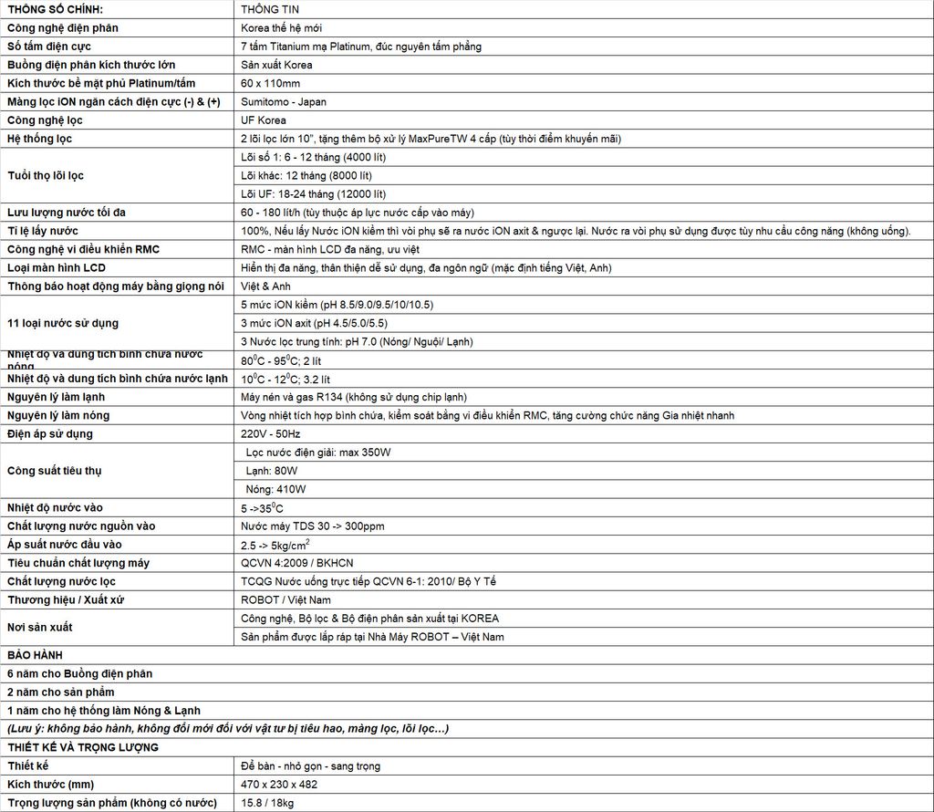 Máy lọc nước điện giải iON kiềm Nóng Lạnh ROBOT niềm tự hào sản phẩm Thế Hệ Mới nhất, công nghệ Korea, hệ thống lọc & điện phân tiên tiến sản xuất tại Korea, 7 tấm điện cực Titanium phủ Platinum kích thước lớn nhất, chất lượng vượt trội nhưng giá thành rất phù hợp người tiêu dùng Việt Nam.