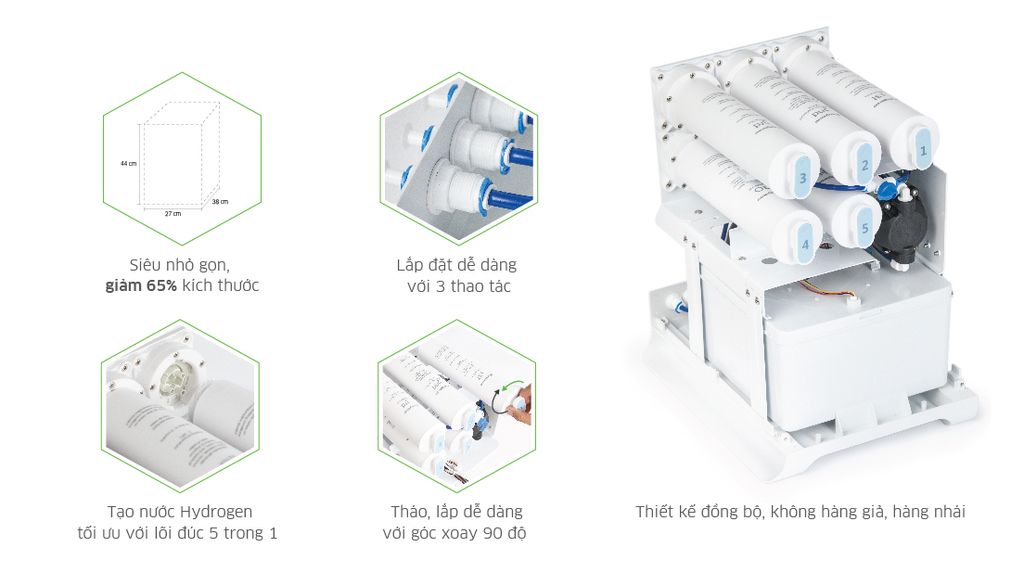 Khác biệt hoàn toàn so với các dòng máy hiện có trên thị trường, từ các lõi lọc thô, màng RO đến bộ lõi chức năng tạo Hydrogen đều được đúc nguyên khối. Điều này đảm bảo sự kín khít tuyệt đối, hạn chế tối đa sự tác động ngược từ môi trường tới các lõi lọc, đặc biệt là tình trạng tái nhiễm khuẩn.