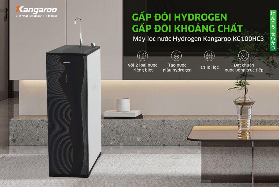 Duy nhất Kangaroo có bằng sáng chế độc quyền thiết bị lọc nước Hydrogen. Nước Hydrogen tươi bổ sung vi khoáng tự nhiên và chất điện giải có lợi, giúp tăng cường miễn dịch và nước có vị ngon ngọt tự nhiên. Đồng thời hoạt động như một chất chống oxy giúp loại bỏ gốc tự do có hại, là tác nhân gây lão hóa, các bệnh dạ dày…