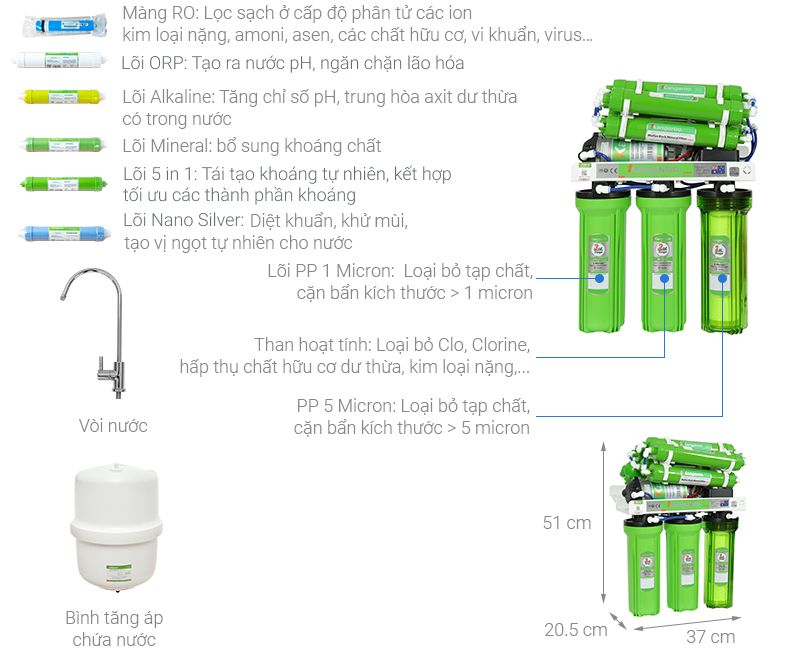 • Lõi số 5 - Nano Silver Omega: Ứng dụng công nghệ NANO, sử dụng Ion Ag+ để thâm nhập vào các tế bào vi sinh vật. Với phương thức này, cột lọc NANO bạc có thể tiêu diệt tới 99.99% vi khuẩn có trong nước. Ngoài ra, cột lọc NANO còn có tác dụng khử mùi cho nước.