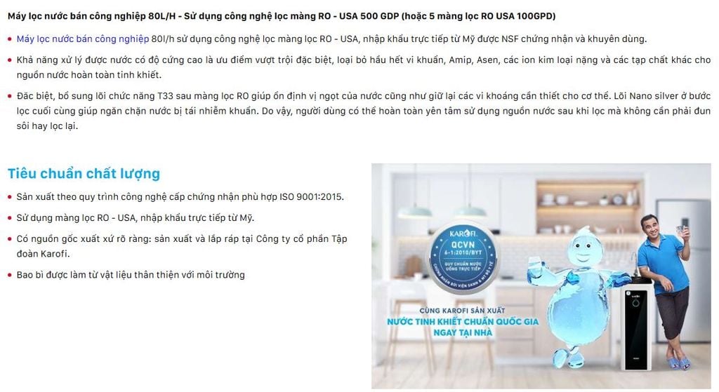 Máy Lọc Nước Karofi Công Suất 80L/h kb80 được trang bị màng lọc RO cao cấp, Máy Lọc Nước bán công nghiệp 80L/H không chỉ mang lại nguồn nước sạch tinh khiết an toàn cho sức khỏe mà còn mang lại sự tiện nghi tối ưu nhờ thiết kế thông minh. Công suất máy 80L/H phù hợp với những cơ quan, tổ chức từ 150- 300 người. Lõi Nano silver ở bước lọc cuối cùng giúp ngăn chặn nước bị tái nhiễm khuẩn. Nguồn nước sau khi lọc có thể sử dụng trực tiếp để nấu nướng, pha chế, uống trực tiếp mà không cần phải đun sôi