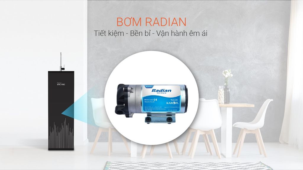 Với cấu tạo đặc biệt, bơm Radian hoạt động bền bỉ, êm ái và có công suất tiêu thụ điện thấp hơn so với các máy lọc thông thường, giúp người dùng tiết kiệm tối đa điện năng sử dụng.