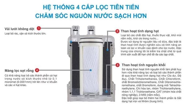| Cấu tạo bộ lọc | Vải không dệt, Than hoạt tính nguyên khối, Than hoạt tính dạng hạt, Màng lọc sợi rỗng |