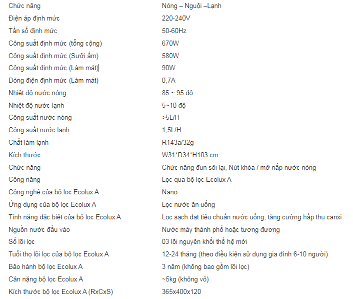 Thông số kỹ thuật của máy lọc nước nóng lạnh Nano Geyser Ecolux A HWC
