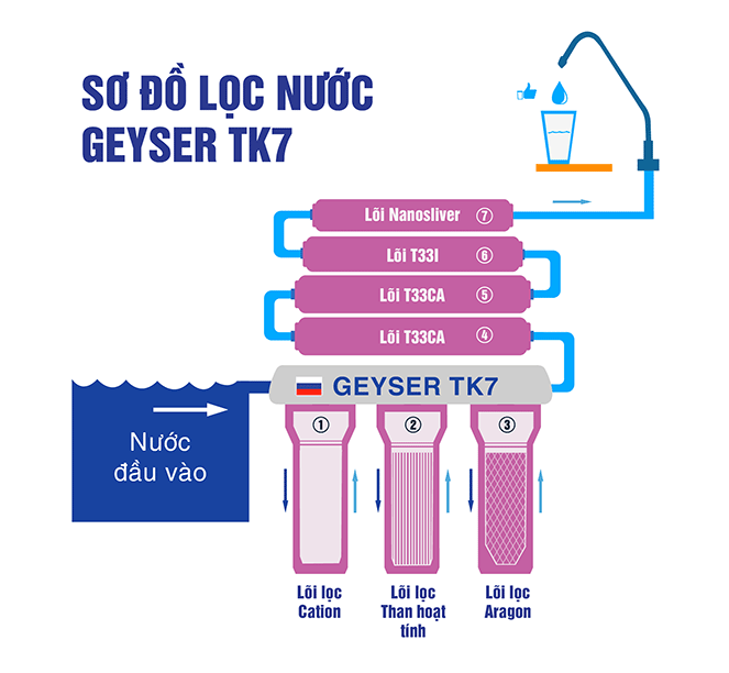 - Máy lọc nước Geyser Tk7 - 7 Lõi lọc sử dụng 7 cấp lọc, Geyser Tk7 loại bỏ 99% vi khuẩn, vi sinh vật, kim loại nặng, tạp chất, thuốc trừ sâu… cho ra nguồn nước sạch, tinh khiết để uống hàng ngày, đảm bảo tiêu chuẩn của Bộ y tế.
