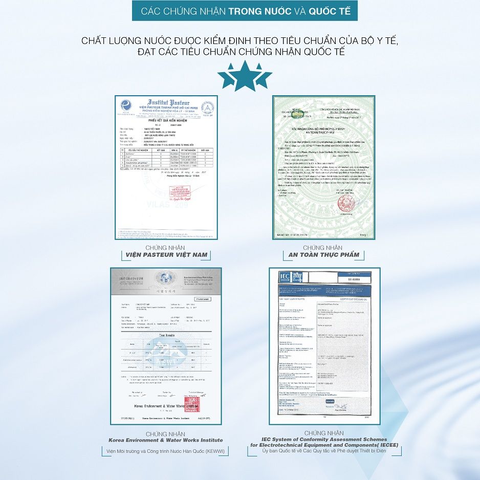 Hệ thống lọc: Lõi lọc thô Sediment, lõi lọc Pre Carbon, lõi Nano Membrane Filter, lõi Hydrogen Alkaline và Silver Carbon.