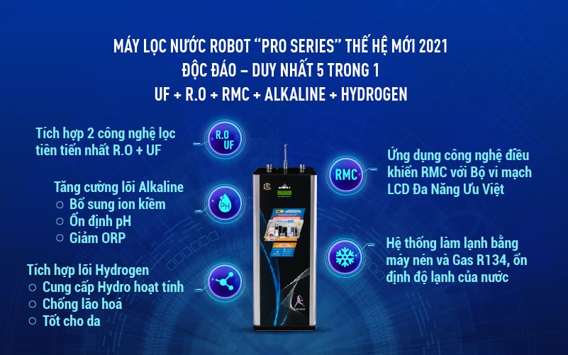 Ưu điểm nổi bật của dòng máy lọc nước ROBOT Pro Series là thiết kế tích hợp cả 2 công nghệ lọc tiên tiến nhất: R.O & UF, được nghiên cứu lọc tốt, phù hợp với nhiều nguồn nước tại Việt Nam.