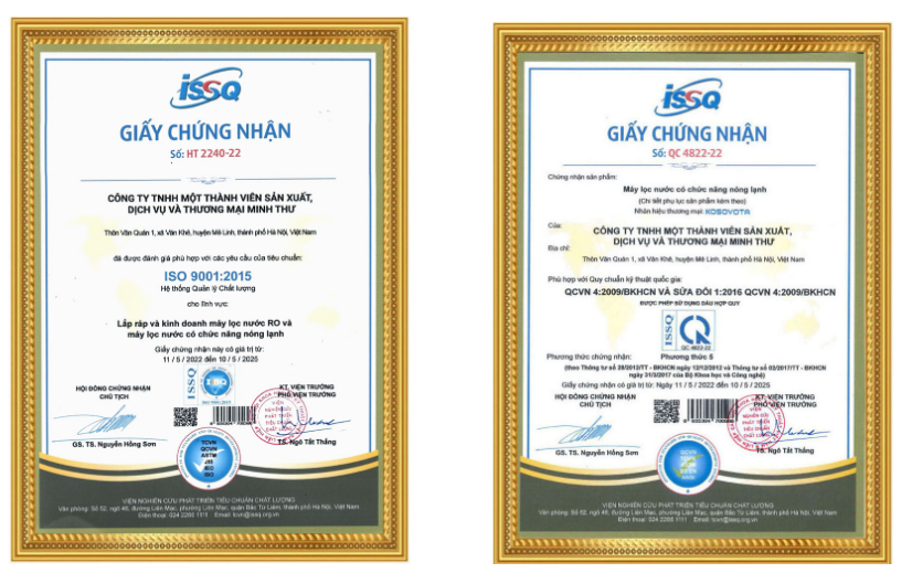 + Chứng nhận Phù hợp Quy chuẩn kỹ thuật quốc gia QCVN 4:2009/BKHCN cho máy lọc có chức năng nóng lạnh.