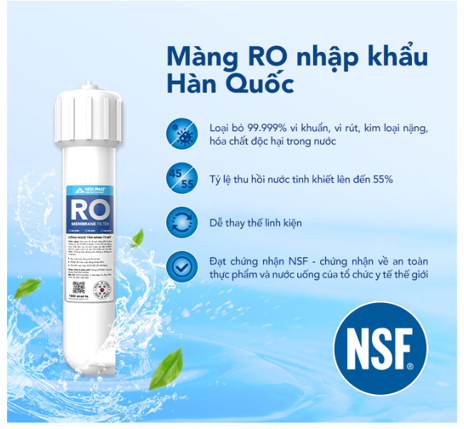 Máy lọc nước sử dụng màng lọc RO được nhập khẩu nguyên chiếc từ Hàn Quốc (vật liệu mạng nhập khẩu từ Mỹ). Màng lọc RO giúp lọc bỏ 99.99% vi khuẩn, virus, kim loại nặng, hóa chất độc hại có kích thước lê đến 0.0001 micron, giúp nguồn nước sau lọc trở lên tinh khiết với các đặc điểm: Không màu, không mùi, không vị, không có vi khuẩn.
