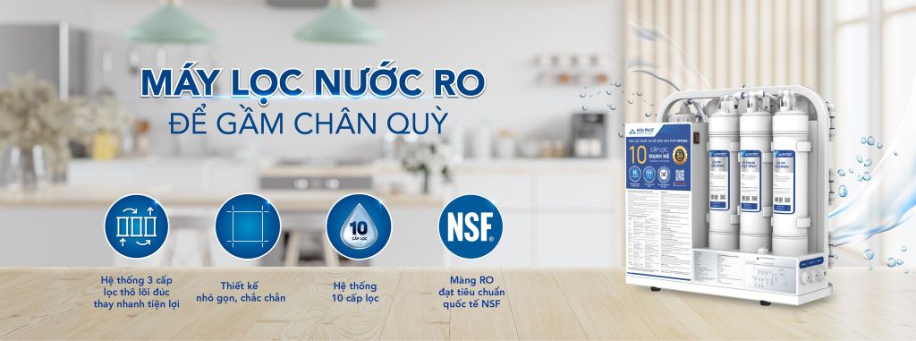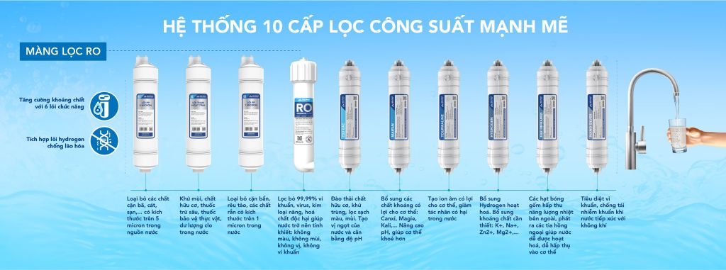Hệ thống 10 cấp lọc mạnh mẽ với 3 lõi lọc thô đúc liền thay nhanh tiện lợi