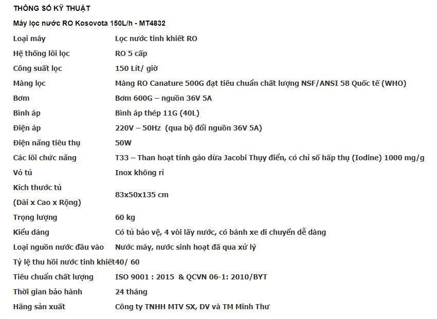 - Có nguồn gốc xuất xứ rõ ràng: Sản phẩm Kosovota được sản xuất và lắp ráp tại Công ty TNHH MTV SX, DV và TM Minh Thư, đơn vị có kinh nghiệm gần 15 năm trong lĩnh vực sản xuất thiết bị xử lý nước.