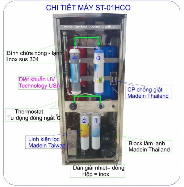| Hệ thống lọc qua 5 cấp | 1. Lõi lọc Sediment, 2. Lõi lọc GAC, 3.Lõi lọc CTO, 4. Lõi lọc nnano, 5. đèn diệt khuẩn UV |