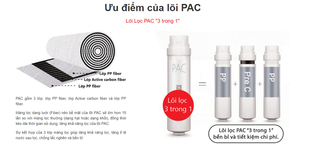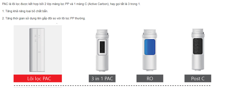 | Lõi lọc thứ 1 và thời gian sử dụng | PAC (PP+Carbon) / 7200L / 12 Tháng |