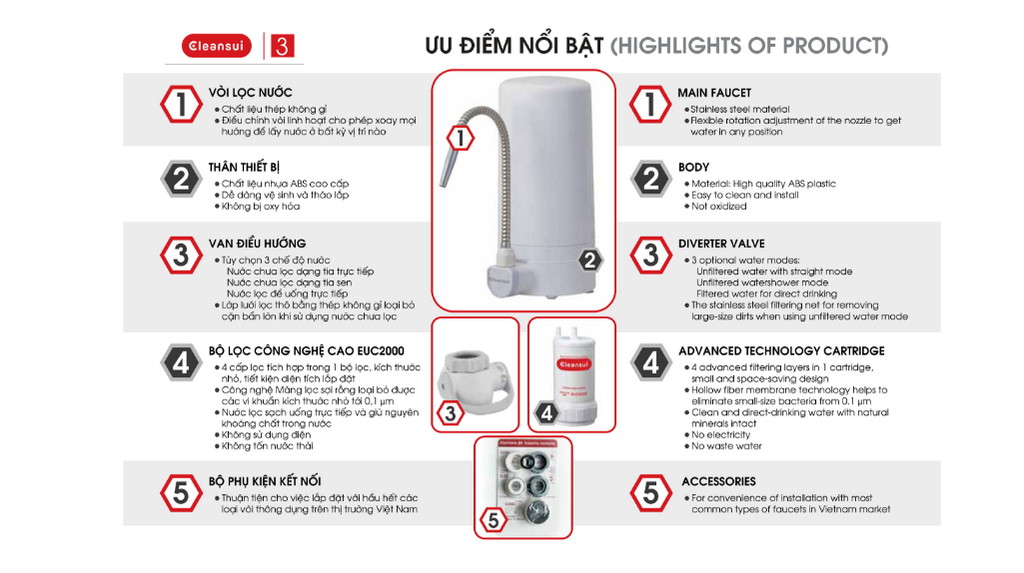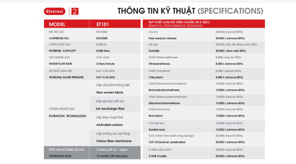 Máy lọc nước ET101 với công nghệ lọc 1 lõi đạt tiêu chuẩn quốc tế, sản xuất tại Nhật Bản giúp loại bỏ 13 tạp chất nhỏ đến 0.1mm cùng gỉ sắt, clo dư nhưng vẫn giữ lại khoáng chất cần thiết cho cơ thể, cho nước có vị ngon tự nhiên. Máy lọc không dùng điện, không lãng phí nước. Quy trình lắp đơn giản, điều chỉnh vòi nước linh hoạt và dễ dàng