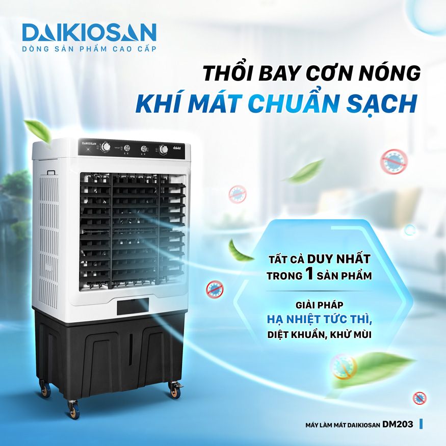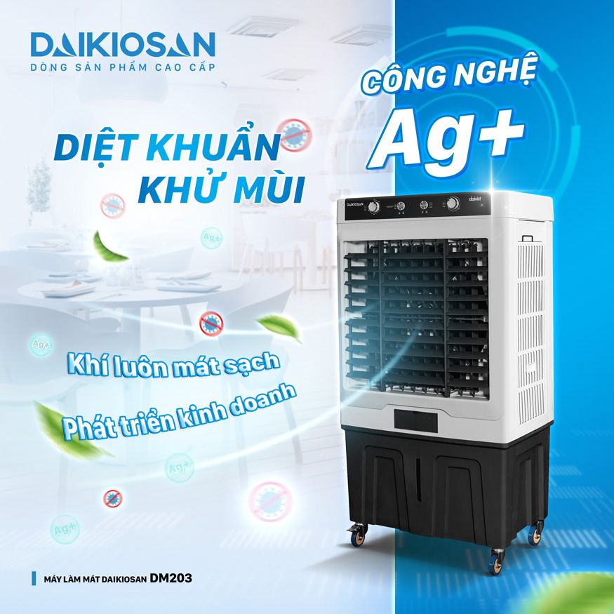 Quạt điều hòa thương mại Daikiosan DM203 sở hữu công nghệ diệt khuẩn tiến tiến Ag+ cùng với lưu lượng gió mạnh có khả năng làm mát trên diện rộng mang đến cho bạn và gia đình một làn gió tươi mát giữa thời tiết oi bức.