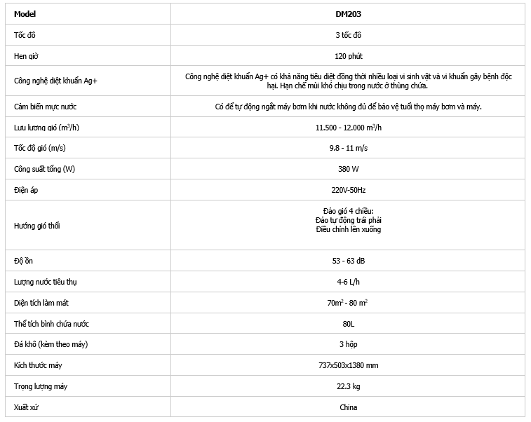 DM203 có công suất khủng tới 380 W cùng tốc độ gió mạnh lên đến 9.8-11 m/s, tạo nên một làn gió mạnh mẽ và làm mát hiệu quả. Với diện tích làm mát rộng từ 70m2 - 80m2, sản phẩm này là sự lựa chọn hoàn hảo cho các không gian lớn như:
